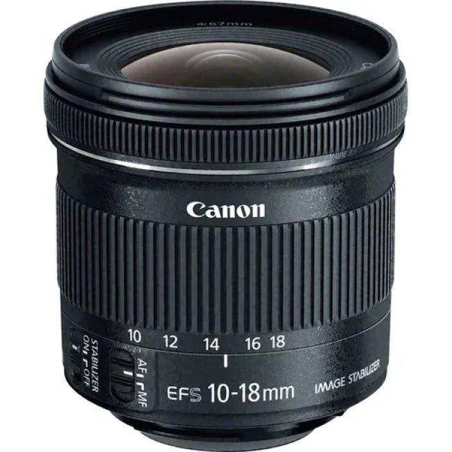 The Canon EF-S 10-18mm f/4.5-5.6 IS STM Lens is a wide-angle zoom lens designed specifically for EOS APS-C DSLRs, where it provides a 35mm-equivalent focal length range of 16-28.8mm. The optical design incorporates one aspherical element, one UD (Ultra-low dispersion) element, and one large-diameter element to minimize chromatic aberrations throughout the zoom range and contribute to notable image sharpness and clarity. Enhanced lens coatings have also been applied to lens elements to minimize lens flare and ghosting for maintained image contrast and color neutrality.