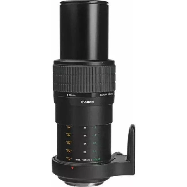 A specialty lens designed for extreme close-up imaging, the MP-E 65mm f/2.8 1-5x Macro Photo from Canon lets you render subjects at up to five-times life-size magnification with a minimum focusing distance of 9.4″. Dedicated solely to macro applications, this lens’s unique design employs a floating elements system to maintain quality throughout the focusing range and one ultra-low dispersion element helps to control color fringing and chromatic aberrations for high clarity and color accuracy. A Super Spectra coating has also been applied to suppress flare and ghosting for greater contrast. This 65mm f/2.8 is strictly manual focus operation only and features a removable rotating tripod collar for improved stability when working atop a tripod. Additionally, the front of the lens is designed to accept an optional Macro Ring Lite or Macro Twin Lite for greater, more even illumination of close-up subjects.