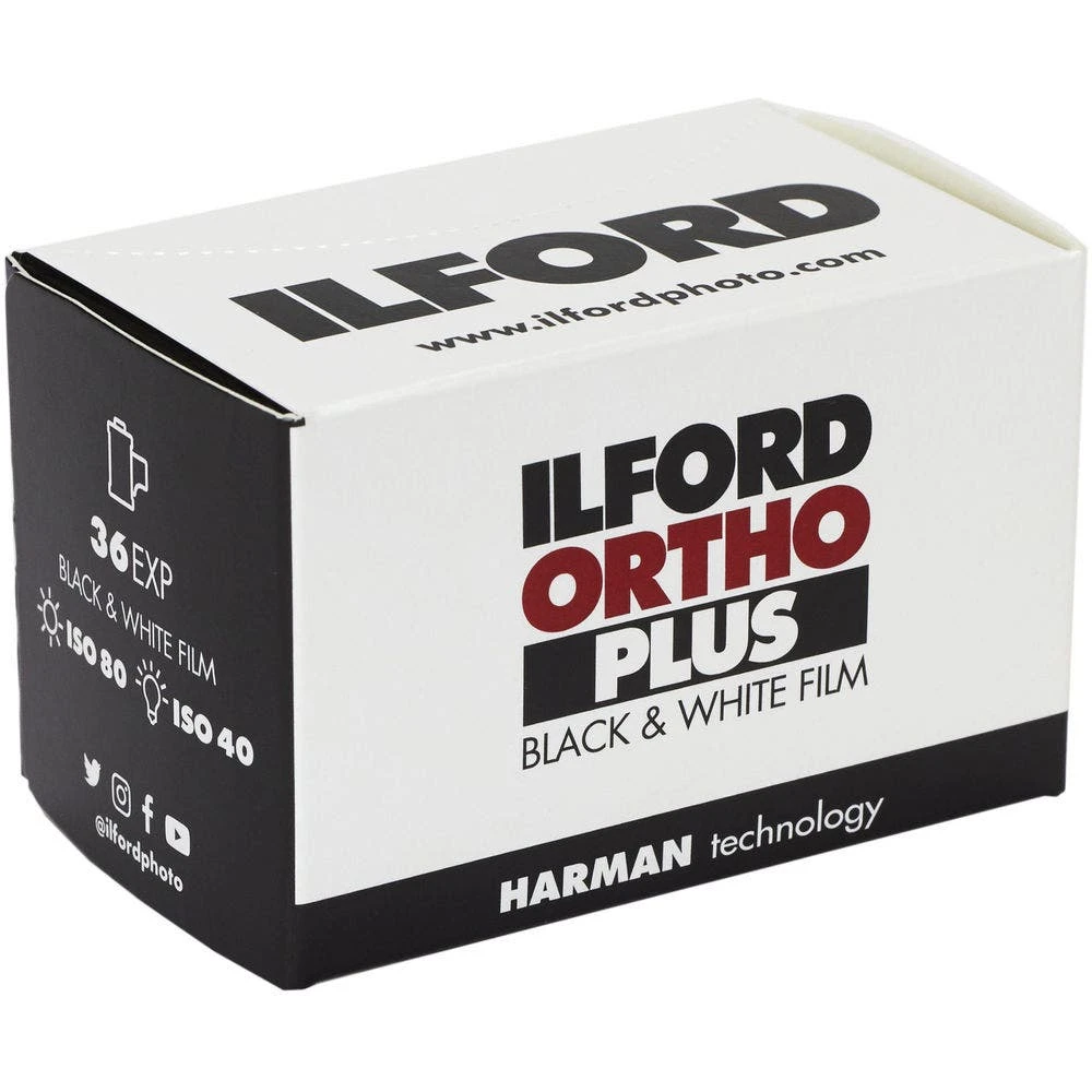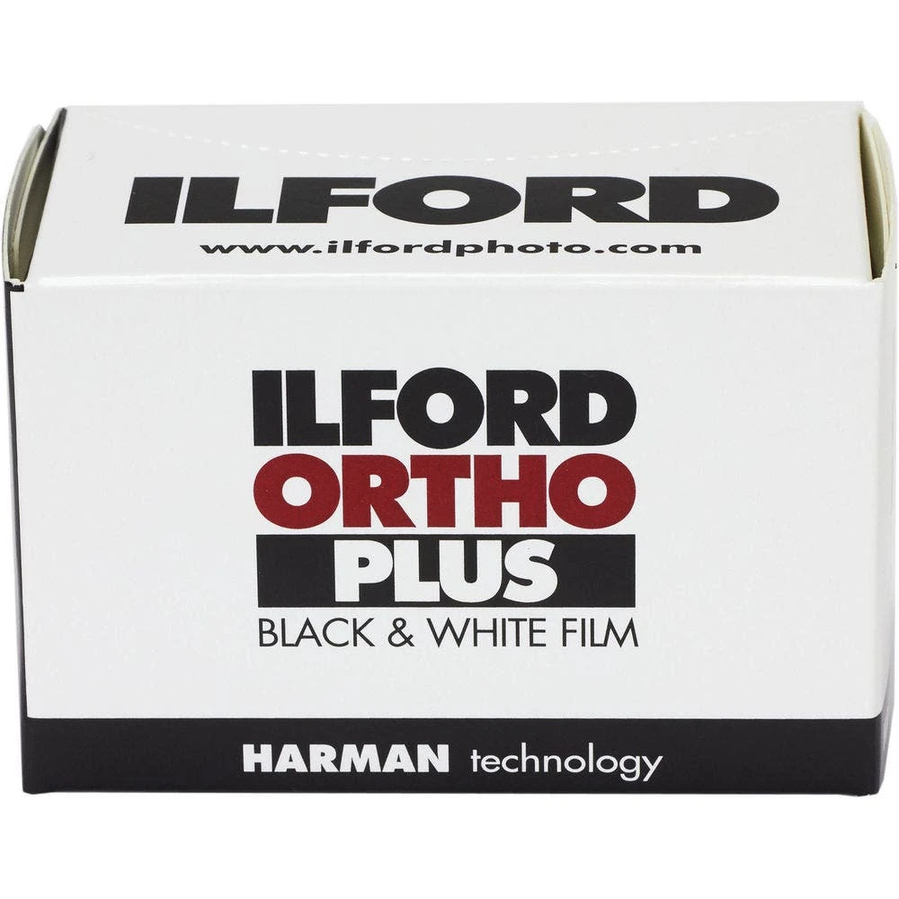 Ilford Ortho Plus is a medium speed black and white negative orthochromatic film that is especially well-suited for continuous tone copy or reproduction work, as well as for half-tone, technical, and forensic applications. It has a nominal sensitivity of ISO 80/20° when exposed under daylight conditions, or ISO 40/17° when exposed under tungsten lighting, and can be developed in standard black and white chemistry. Additionally, since the film is only sensitive to blue and green light, it can be handled under red safelight conditions and developed by inspection for precise processing control. Its high-resolution, fine grain structure and long tonal range also make it ideal for producing faithful reproductions of original artworks and documents, as well as for photomicroscopy.