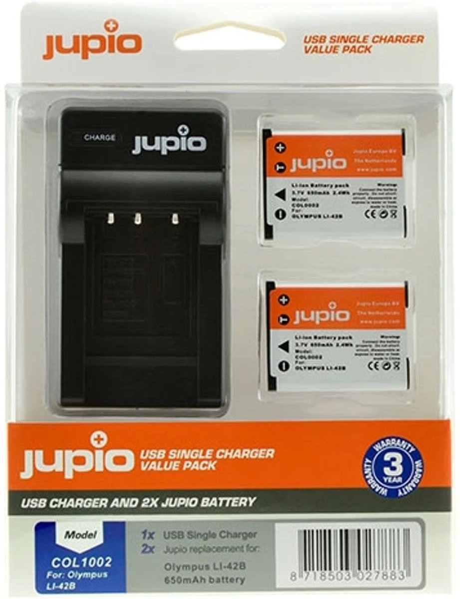 This Jupio Olympus Li-42 Twin Battery plus Charger Kit. A set containing twice the camera battery Li-42 1270mAh for Olympus. A charger is also included. This charger is powered by USB. With this set, you no longer have to worry about your battery capacity. If your battery is empty, you just pick up a new one.Â