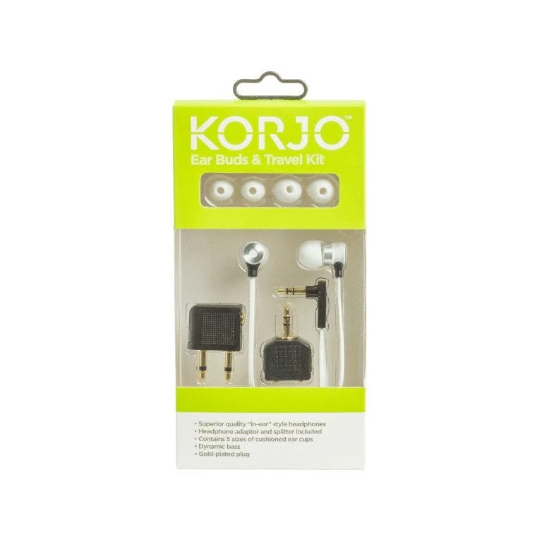 One Set of superior quality “in-ear” style earbuds. This Korjo Ear Buds and Travel Kit is ideal for travel or home use plus a headphone adaptor and headphone splitter. Perfect for use with smartphones, music players, tablets, and laptops.