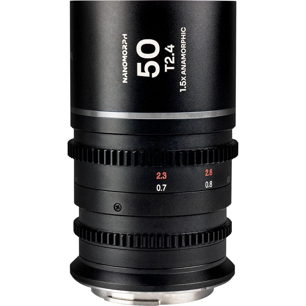 The Laowa Nanomorph 50mm T2.4 1.5x S35 Anamorphic Lens Venus Optics is a slender, compact anamorphic lens that captures high-definition video with 1.5x anamorphic squeeze on cameras with S35 sensors. It features a focal length of 50mm, a Leica L lens mount, an aperture range of T2.4 to T22 for a deep depth of field, and 13 iris blades for a shallow depth of field and soft bokeh