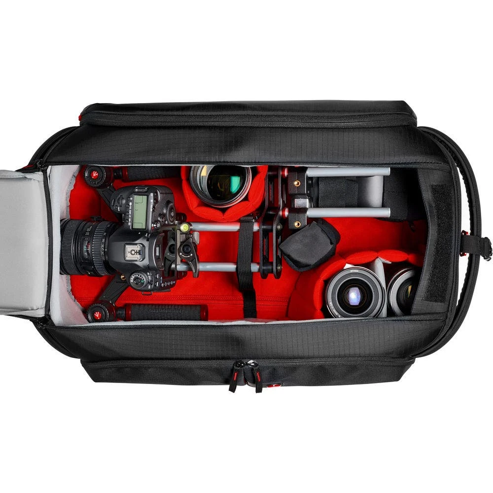 Made from water-repellent ripstop nylon and offering a padded interior, theΓΒ Manfrotto 195N Pro Light Camcorder Case will protect your camera from bumps and shocks, as well as inclement weather conditions. Opening up the convenient dual-zippered closure reveals the main compartment. The interior of the case can be fitted with the included dividers for optimal protection. Manfrotto’s Flexi dividers are composed of specially shaped red foam padding, allowing them to be wrapped around your gear for a snug fit while maximizing interior space. The bottom of the main compartment is comprised of the same foam material as the Flexi dividers, forming shock-absorbent pockets within the main compartment.