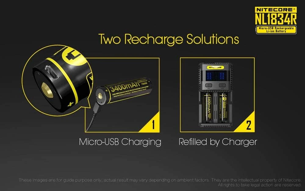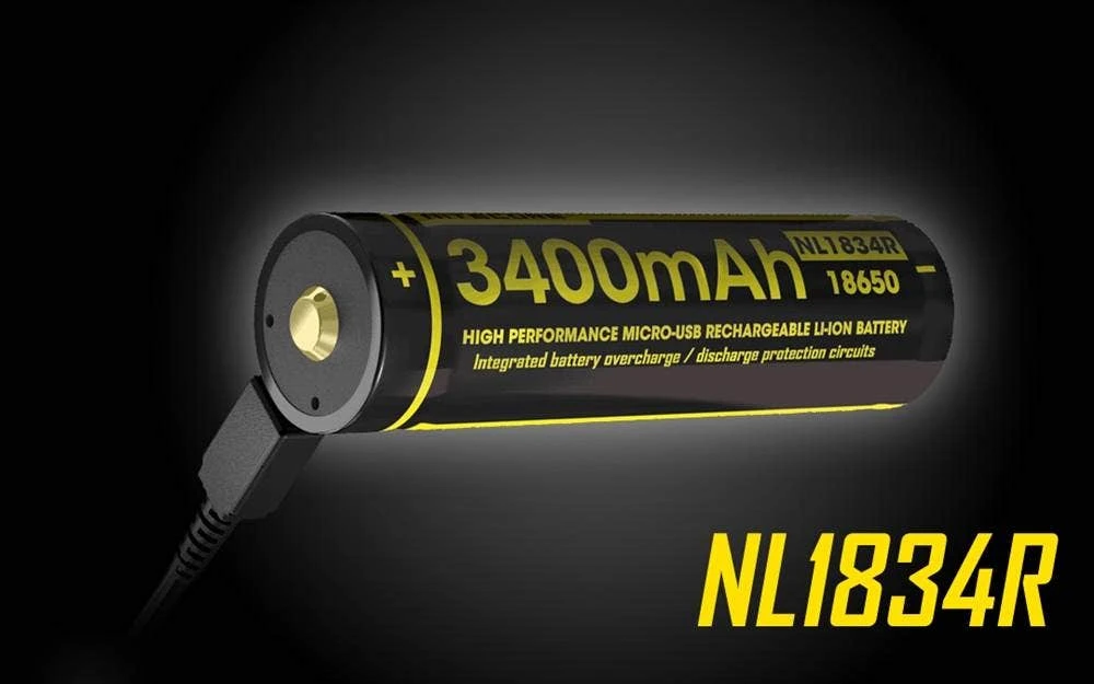 The new Nitecore NL1834R 18650 battery is a revolutionary battery designed with a built-in micro-USB charging port making charging easier than ever! No more need for an extra charger as this battery can be charged directly using a standard micro-USB charging cable (sold separately). Simply plug the battery into an available power source and a red indicator light under the + pole (positive) will turn green upon completion. Alternatively, these batteries can still be charged on an external charger if desired. The NL1834R batteries are designed for powering high drain devices such as high-output flashlights, lanterns, headlamps, and bike lights, as well as a variety of other appliances and devices. With built in smart charging circuitry and other integrated safety features through-out, this battery will safely work in the majority of button-top compatible devices.