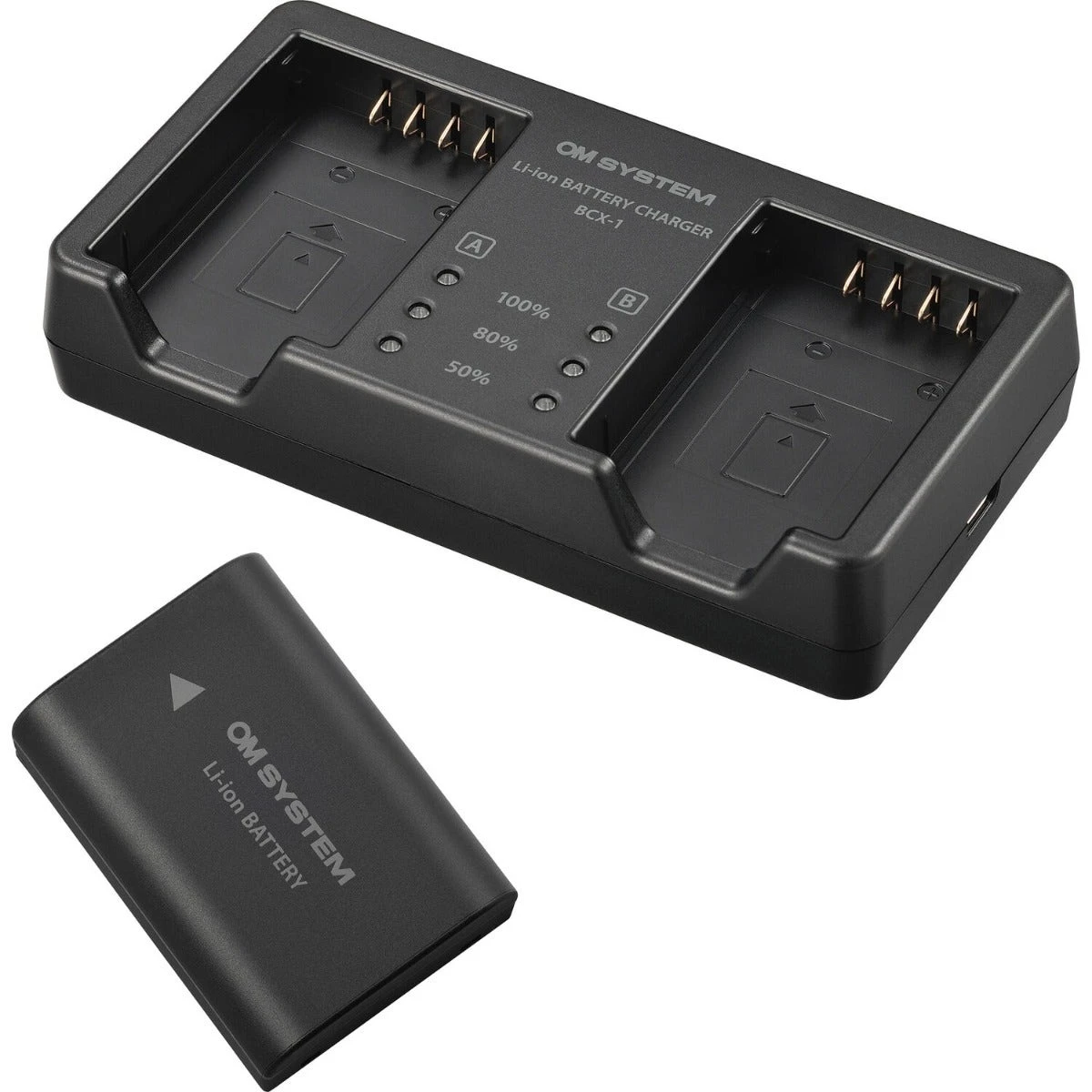 The OM SYSTEM SBCX-1 Lithium-ion Rechargeable Battery and Charger Set includes one BLX-1 Lithium-Ion Battery and recharges one or two BLX-1 batteries at the same time.