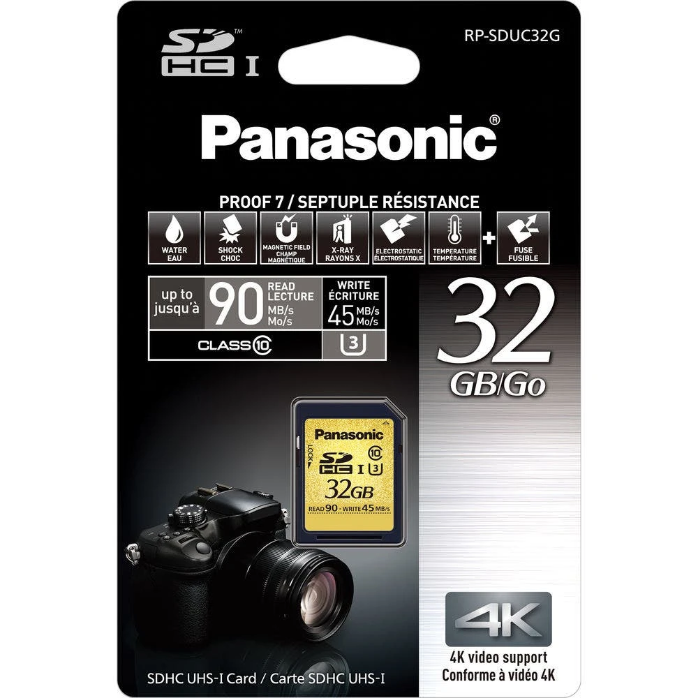 The Panasonic 32GB U3 SDXC Memory Card (Class 10) memory card designed to support both 4K and 2K video recording as comes with a minimum write speed of 30MB/s when used with UHS Speed Class 3 host devices. When used with non-UHS Speed Class 3 host devices, this memory card offers minimum write speeds of up to 10MB/s. Along with the enhanced minimum write speed, you also benefit from a max read speed of 90MB/s and max write speed of 45MB/s. To protect your valuable data, this card is water, shock, x-ray, and magnet proof. It is also resistant to extremes in temperature, with a usable temperature range of -13 to 185Β°F (-25 to 85Β°C). Also, a built-in fuse protects the card and its contents from power surges.