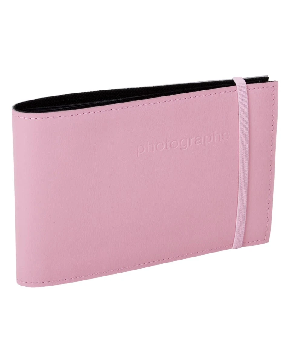 - Made with a bonded leather cover, matching elastic strap to keep your album closed, and black slip-in pages.