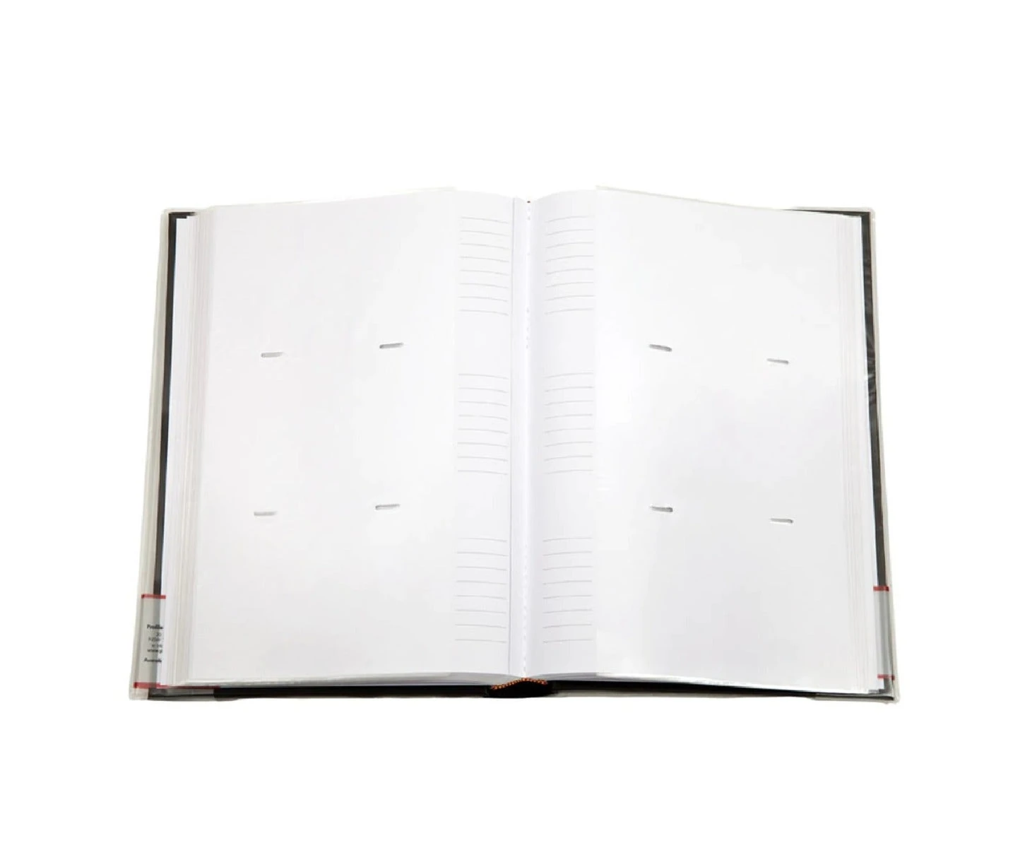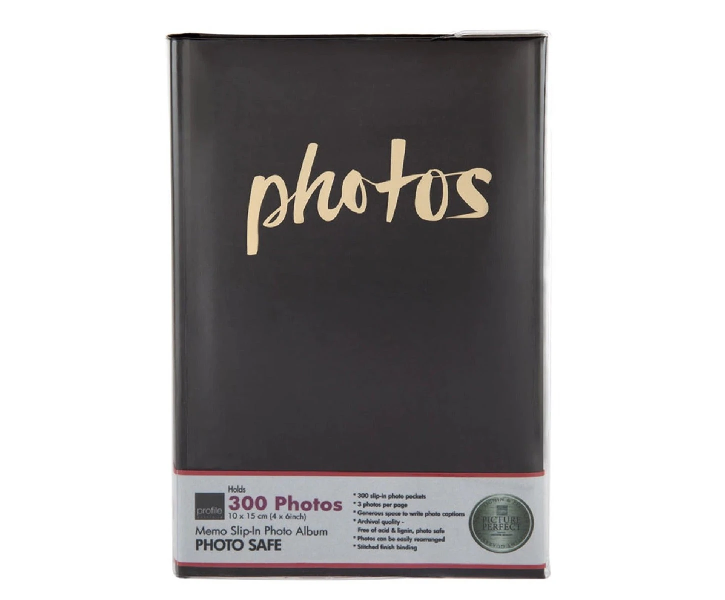 TheΒ Black Profile Moda Album -‘ Photos” 300 Photos 4×6″ features photo pockets to slide in your photos, along with lined memo space in the 200 and 300 capacity next to each photo to keep a record of your precious memories. The 500 capacity album does not have a lined memo space.