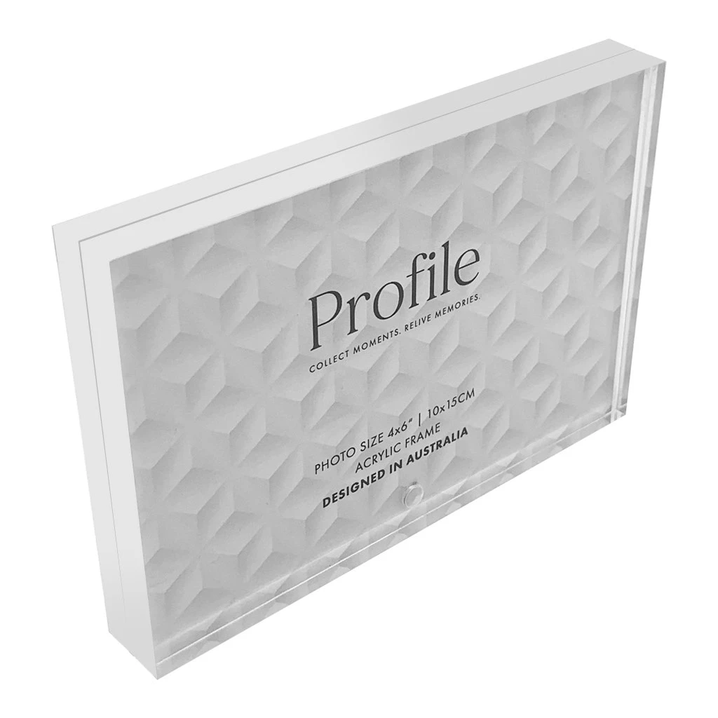 The Profile Platinum Newtown Photo Frame is a crystal clear acrylic picture frame held together by a magnet and invisible tape.