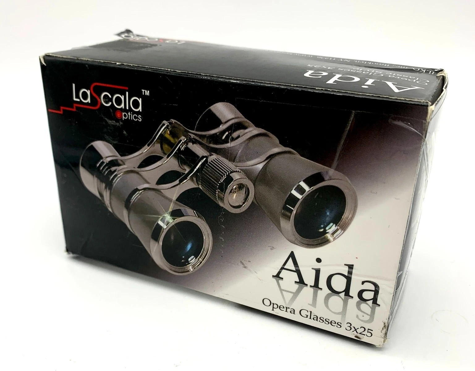 These near-mint pre-owned LaScala Optics 3×25 Carmen Opera Glasses Blue and Silver combine elegant styling with simple functionality to give you an optic with which to enjoy most stage performances. A wide 11.2Β° angle of view and relatively low 3x magnification provide an immersive theatre experience that brings the players closer while still allowing you to see the entire production. An easy-to-find centre focus wheel ensures a crisp view, while the attached chain keeps your opera glasses ready when needed. The compact design and light 5.5-ounce (156gm) weight mean they’ll be comfortable to carry in your bag or pocket.